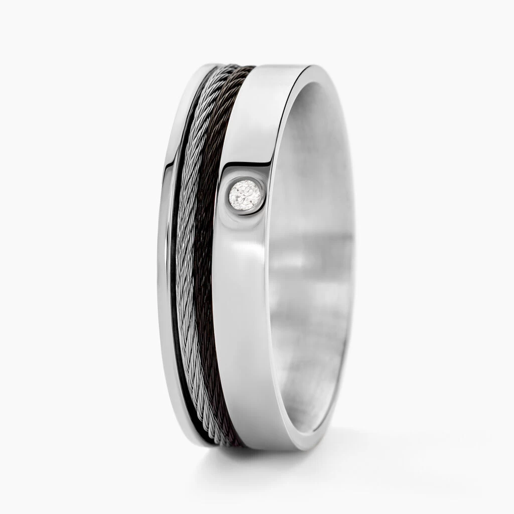 Moderne et stylé en même temps, cette bague en acier est parfaite pour compléter vos looks branchés. Original, son anneau est caractérisé par des câbles noir et gris argenté. Un diamant blanc est disposé en serti clos pour donner davantage de caractère à cette bague.