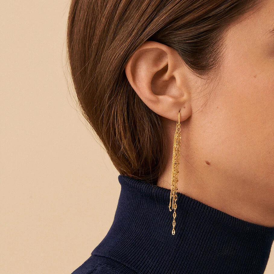 Boucles d’oreilles mi-longues, en laiton doré 750/1000, faites d’un pompom de 6 chaines de différentes longueurs