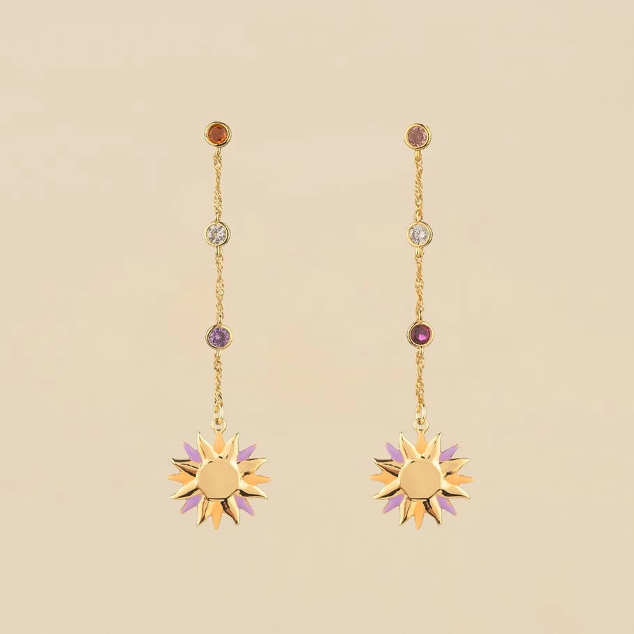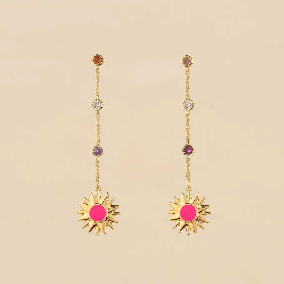 Boucles d’oreilles mi-longues, en laiton doré 750/1000, oxydes de zirconium setis clos sur chaine et soleil émaillé au bout