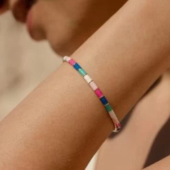 Bracelet fin, en argent véritable doré 750/1000, avec une trilogie d’oxydes de zirconium percés en formes de poire, rond et coussin