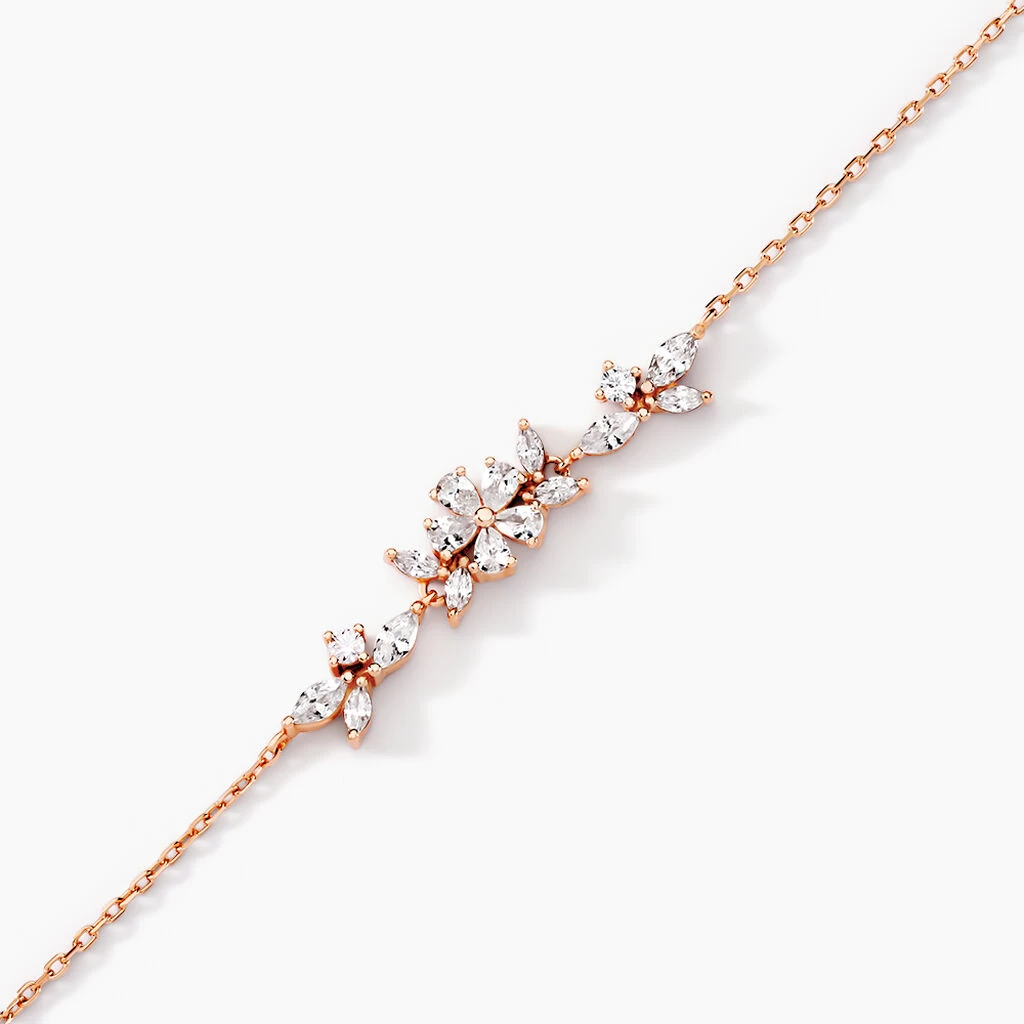 Bracelet Argent Rose 925/1000 Motif Fleur Et Feuilles Oxydes De Zirconium 18.5cm