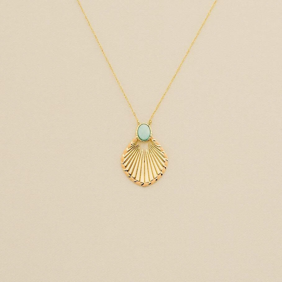Collier mi-long, en laiton doré 750/1000, avec une grande plaque en forme de goutte au motif rayonnant et une pierre naturelle. La bordure est tressée et émaillée.