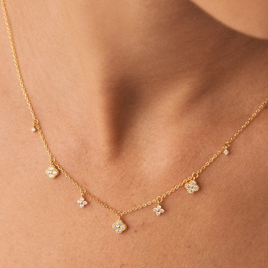 Collier court, en argent véritable doré 750/1000, avec des fleurs d’oxydes de zirconium en pampille et un fin graineti sur le pourtour