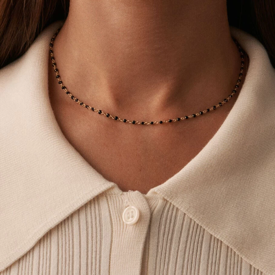 Collier court, en laiton doré 750/1000, perles d’émail sur toute la longueur