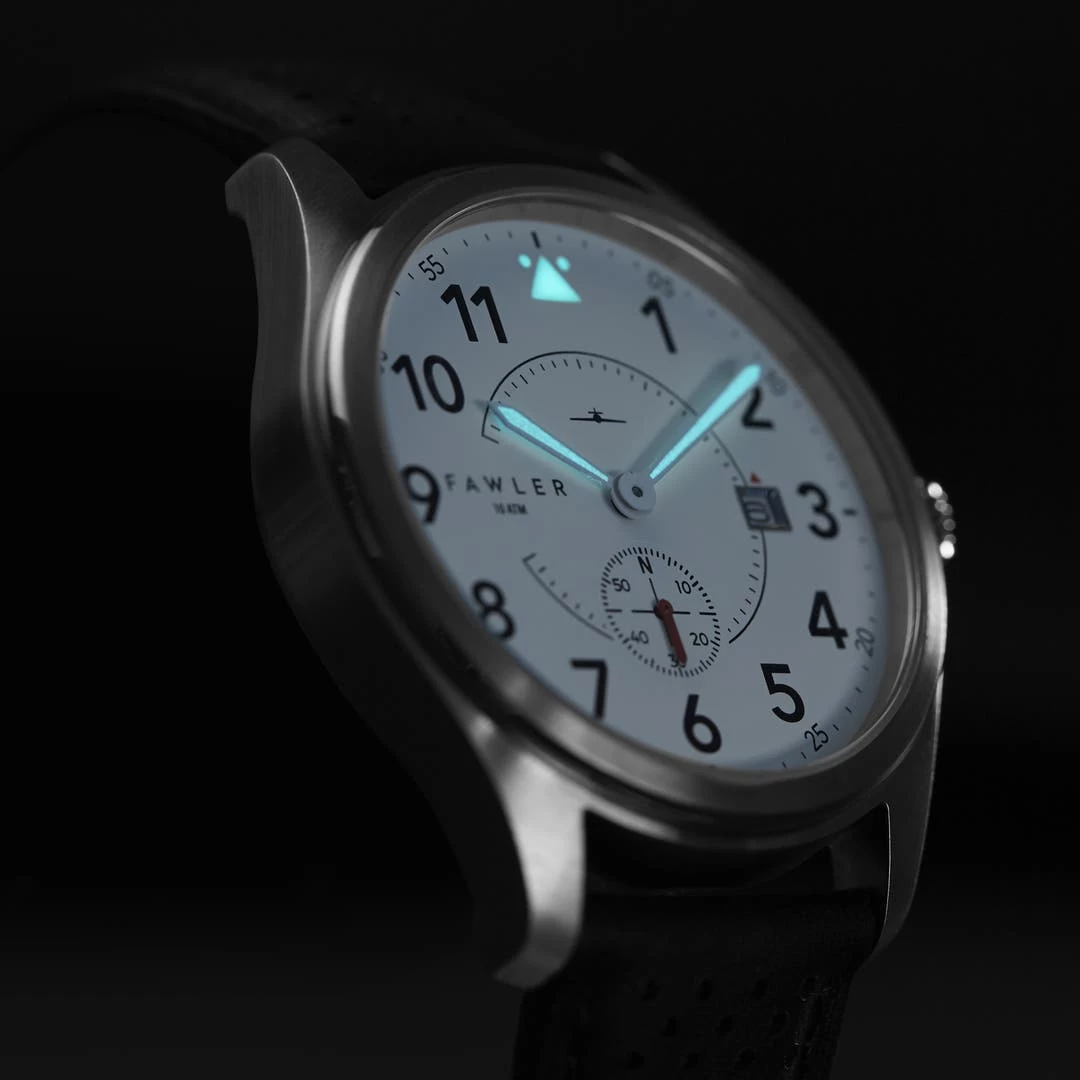 Cartier avait conçu la première montre pour pilote avec un cadran blanc, un bracelet en cuir noir et des graduations & aiguilles noires. Les designers de Fawler se sont inspirés de ces couleurs pour créer une montre moderne pour l’homme contemporain.