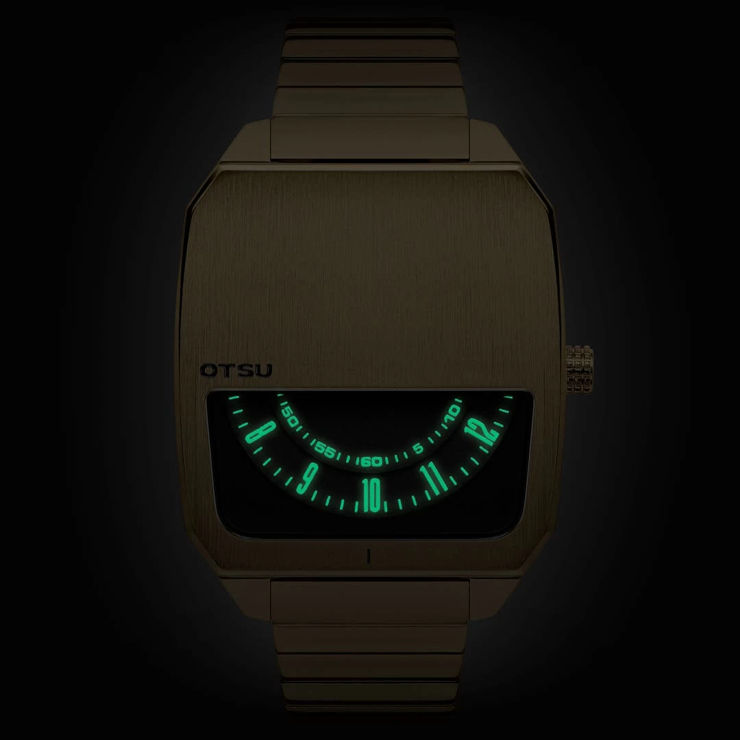 Au bas du cadran de la montre, un trait très discret pointe vers le centre de la montre. Pour lire l’heure, prolongez simplement ce trait jusqu’aux cadrans des heures et des minutes. Une lumière phosphorescente rendra cette montre lisible même dans l’obscurité totale. Le logo OTSU en émail noir décore fièrement sa face avant.