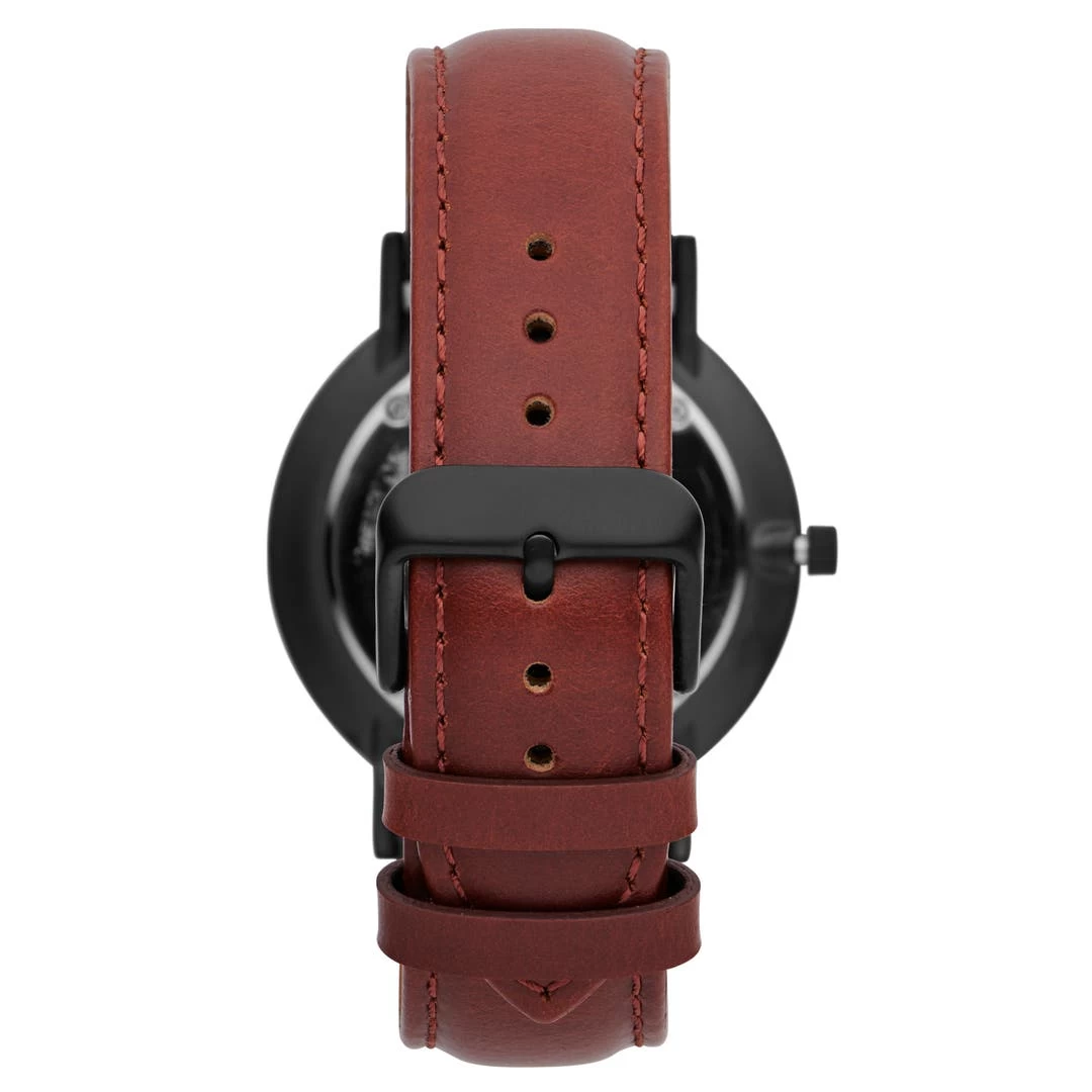 Elle est équipée d’un bracelet en véritable cuir marron doux et confortable. La pointe de sa trotteuse est de couleur bleue, aussi subtile qu’élégante.